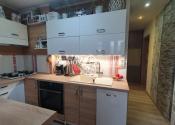 KUCHYŇA: Nová kuchynská linka so vstavanými spotrebičmi (elektrická rúra, plynová varná doska, výsuvný digestor, umývačka riadu), veľký granitový drez s